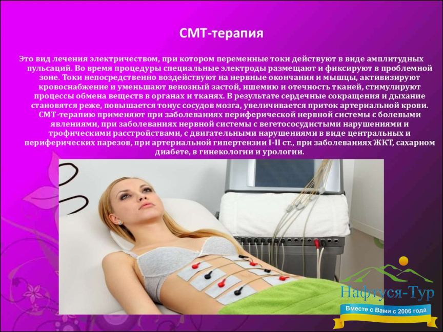 СМТ-терапия – вид электролечения, при котором используется эффект благотворного влияния на человеческий организм токов, соответствующим по частоте его биоритмам. Проведенные исследования показали, что для обеспечения данного соответствия электрические колебания должны производиться в диапазоне 2-10 кГц. Используемая в санаториях для СМТ-терапии аппаратура позволяет точно задавать не только частоту воздействующих импульсов, но и их амплитуду и серийность. Процедуры по данной методике назначаются отдыхающим в здравницах при лечении широкого круга заболеваний, в первую очередь болезней, относящихся к неврологическому, костно-мышечному, сердечнососудистому профилю, к недугам желудочно-кишечного тракта. Отметим ещё два факта: СМТ-терапия помогает пациентам заметно ослаблять боли, а во время её сеансов возможно также введение в организм медикаментозных средств.