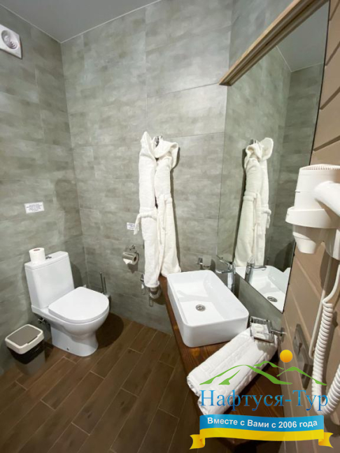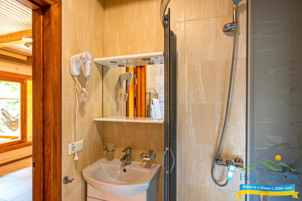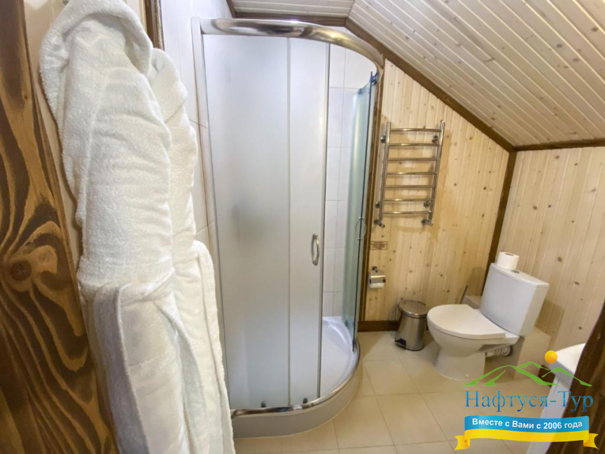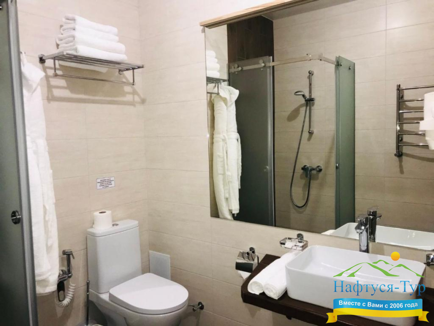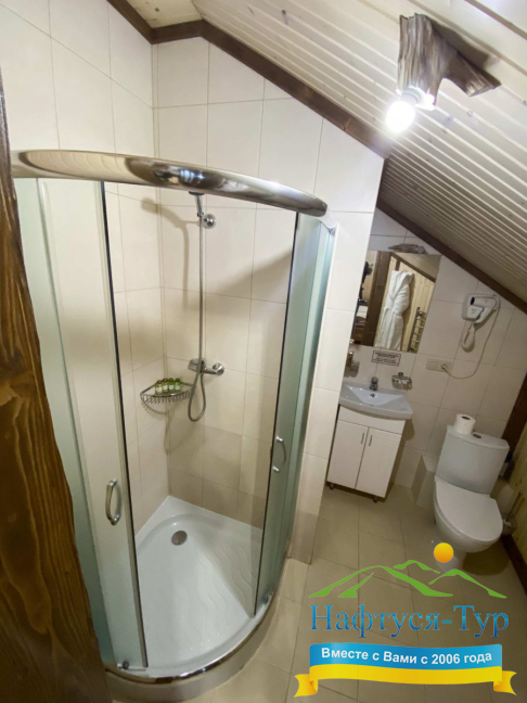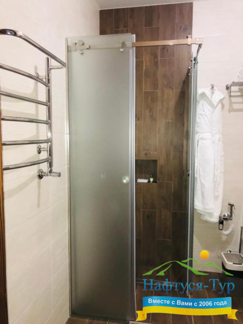 - душевая кабина, фен, халат, косметический набор