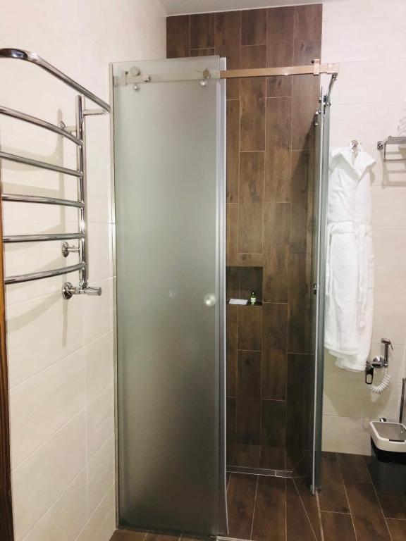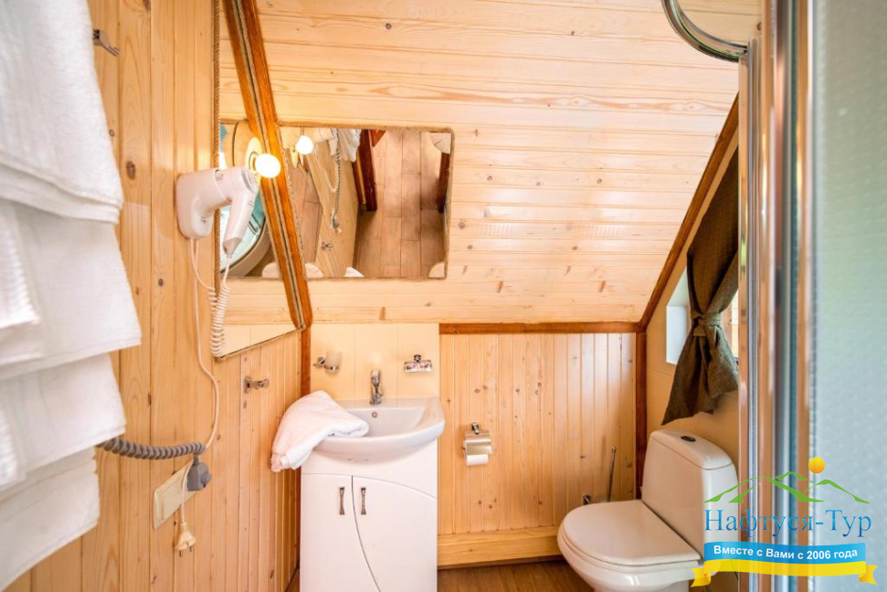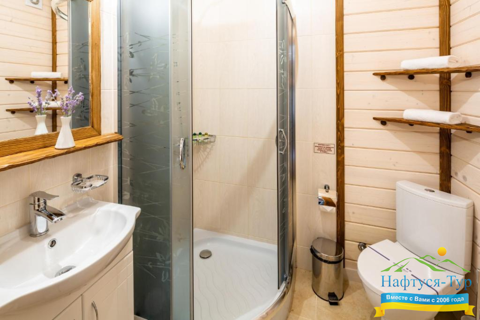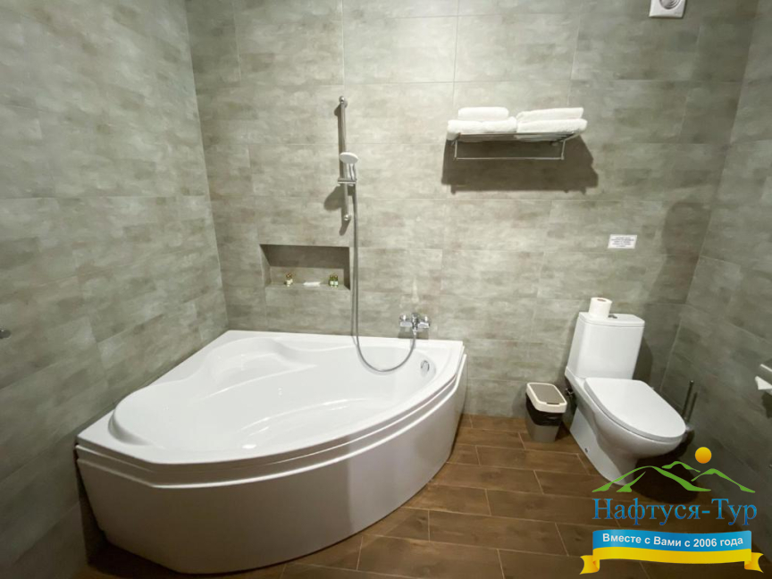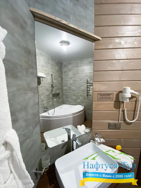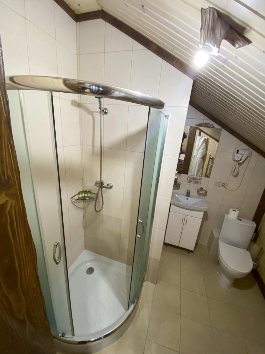 - душевая кабина, фен, халат, косметический набор