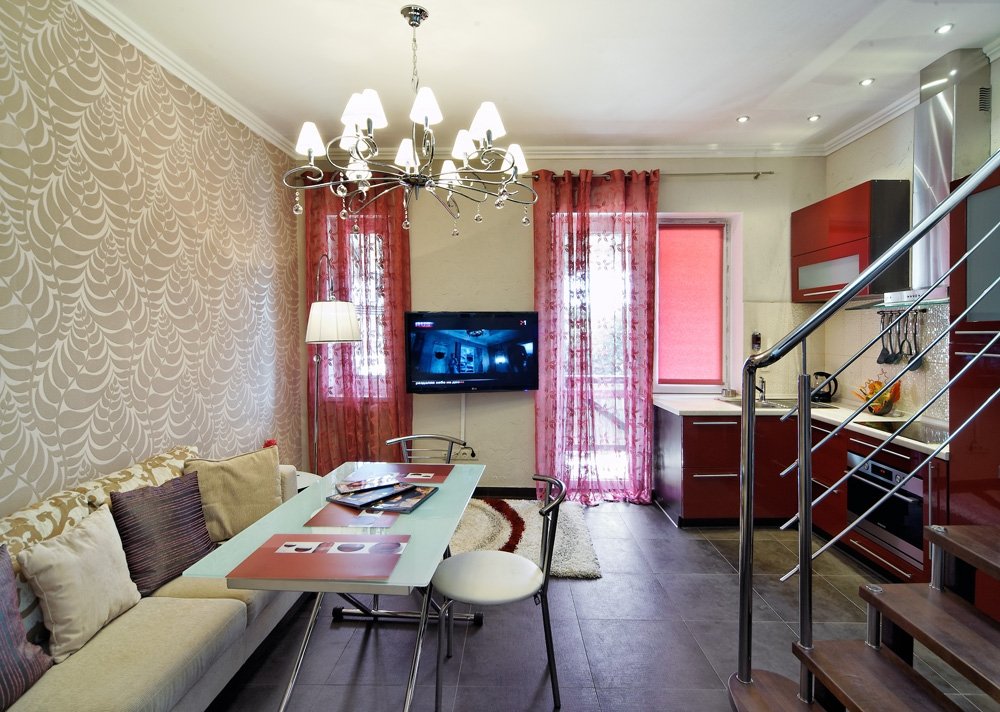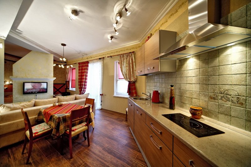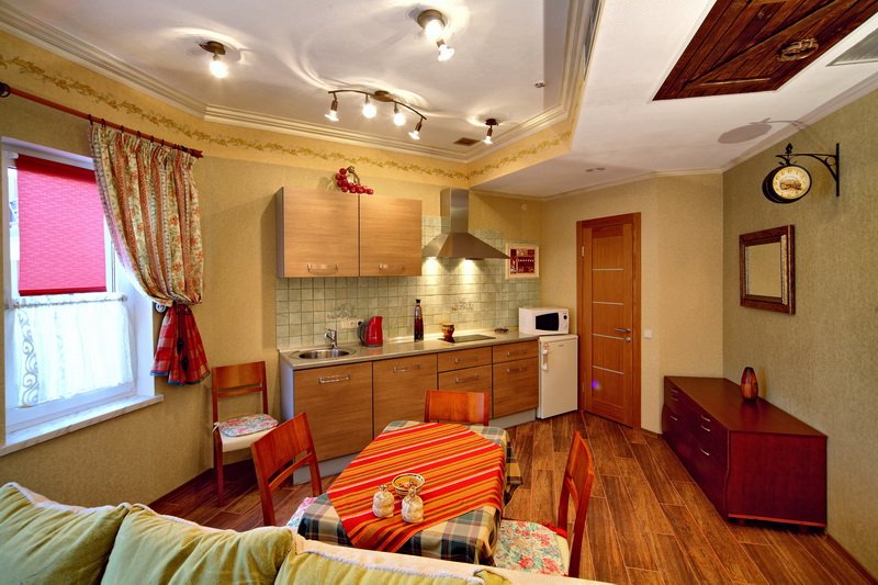 - холодильник, раскладной диван, кухня