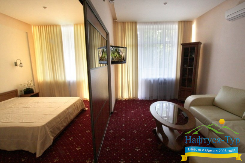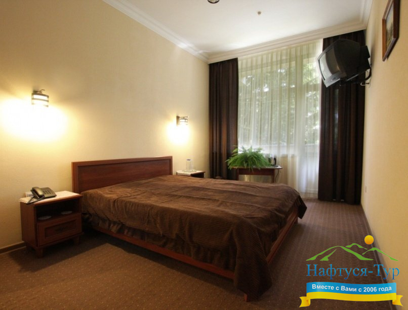Проживание организовано в комфортных номерах различной категории: от стандартных до люксовых. Каждый номер оборудован всем необходимым для удобства гостей: мягкая мебель, телевизор, кондиционер, санузел. Для отдыхающих предусмотрено трехразовое диетическое питание, которое может быть скорректировано в зависимости от лечебных рекомендаций.